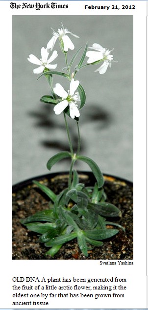 Written by reporter Nicholas Wade, the article says ” Living plants have been generated from the fruit of a little arctic flower, the narrow-leafed campion, that died 32,000 years ago, a team of Russian scientists reports. The fruit was stored by an arctic ground squirrel in its burrow on the tundra of northeastern Siberia and lay permanently frozen until excavated by scientists a few years ago.”